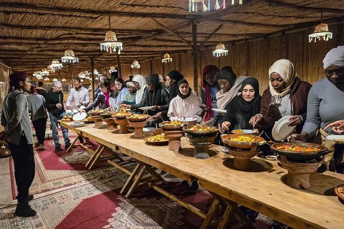 Back at Oasis Sky Camp, some folks jumped straight into the pool—I hesitated (it was colder than I thought), but ended up dipping my feet while others splashed around. Dinner came out steaming: harira soup (smelled like cumin and tomato), then chicken tagine with olives and lemon that fell off the bone. We ate outside under lanterns while Berber musicians started playing near a fire. At one point someone did this wild fire dance—I nearly dropped my tea watching him spin flames against the dark sky. It all felt a bit surreal, honestly.