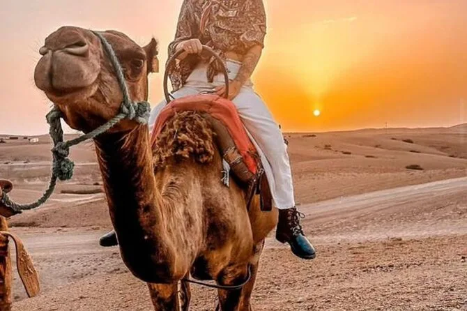 The camel ride takes place at sunset around small dunes; exact duration may vary but usually lasts about 30-45 minutes.