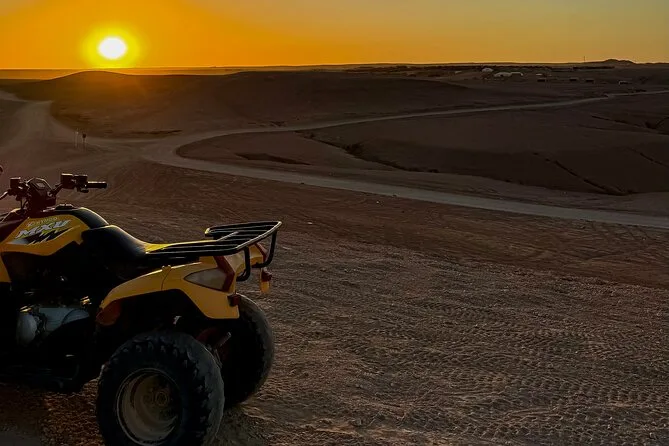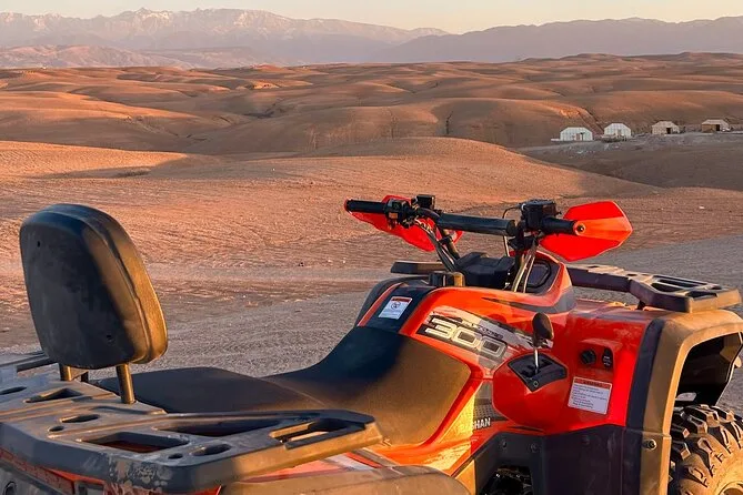 Your evening includes hotel pickup from Marrakech in an air-conditioned vehicle, a 40-minute double quad bike ride across Agafay Desert (if you choose that option), followed by a 20-minute dromedary ride at sunset. Afterwards you'll relax at La Rosa Agafay with a three-course Moroccan dinner featuring local dishes, coffee or tea, live music performances, and a fire show before heading back to town.