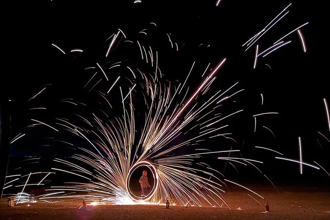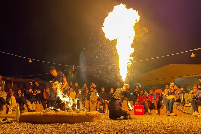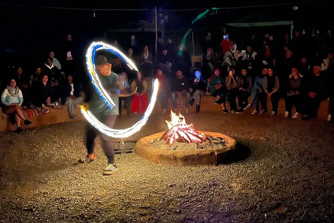 By nightfall we reached this big tented spot—La Rosa Agafay, I think?—with lanterns swinging and music drifting out. Dinner came in waves: couscous, tagine with apricots (still thinking about that sauce), flatbread warm enough to steam your hands. Local musicians played something that sounded half like jazz and half like old Berber songs; people clapped along even if they didn’t know the rhythm. Then came the fire show—honestly wild how close those performers get to the flames. At one point someone handed me tea and for a second everything felt slow and golden. We left late, tired in that good way where you know you’ll sleep deep.