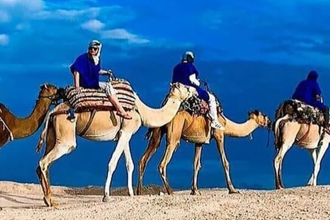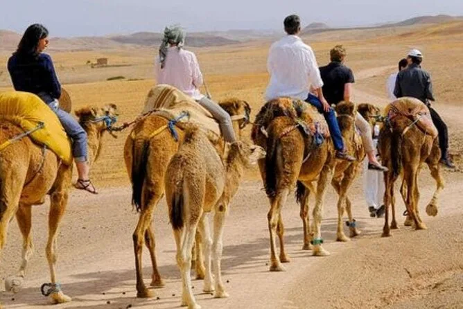Your afternoon includes pickup from Marrakech by air-conditioned vehicle before heading out to Agafay desert for an hour-long quad bike ride (two per quad), followed by a 20-minute solo camel ride at sunset. You’ll unwind by a pool among dunes before enjoying traditional Moroccan dinner with live Berber music and a fire show before returning to Marrakech in the evening.