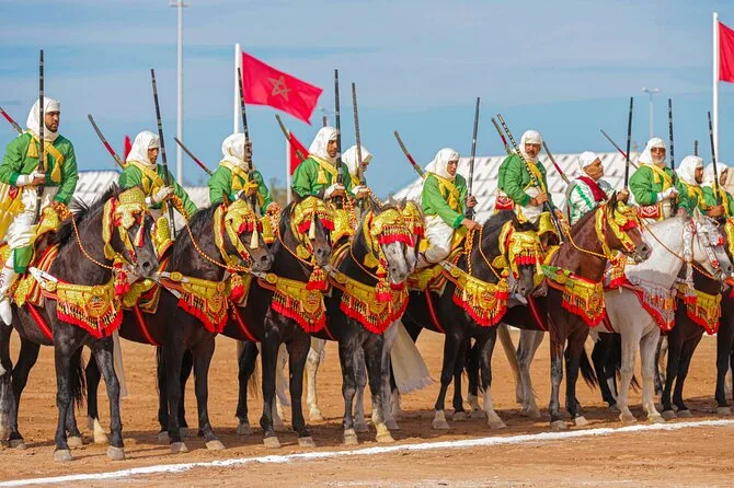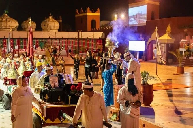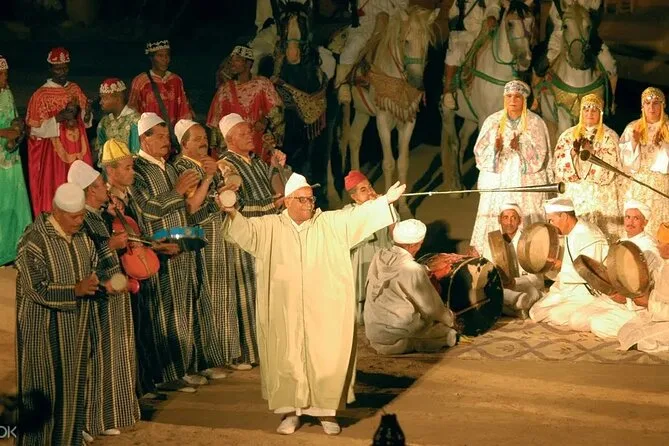 Your evening includes comfortable hotel pickup and return by professional driver, entry to Chez Ali’s Berber tents for a full Moroccan dinner with local specialties like tagine and mint tea, plus seats for all live music performances and the outdoor Fantasia horse show before heading back relaxed (and probably very full).