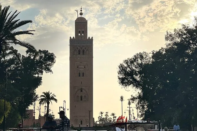 Your morning or afternoon includes guiding by a licensed local expert through Bahia Palace (entry fee extra), stops at Jemaa el-Fna Square, Koutoubia Mosque from outside, Ben Youssef Mosque area, Jewish Quarter history walk, time exploring different sections of Marrakech’s famous souks plus tea and sweets at a Berber pharmacy before finishing back near the square.