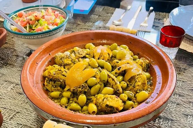 You’ll prepare salads like zaalouk and taktouka, several tajines or couscous options, plus m’hencha dessert.