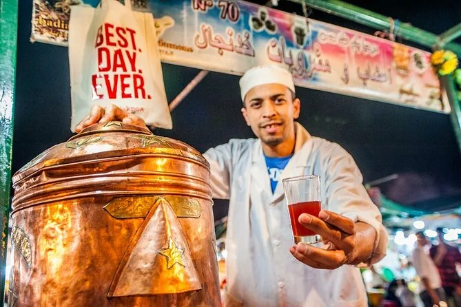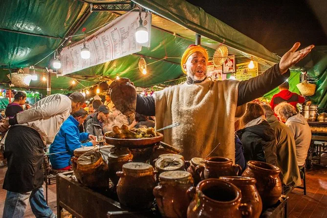 Your evening includes tastings of street foods like ghoulal snail soup and preserved meats as you wander souks with your local guide; you’ll visit vibrant spice markets, sample olives and pastries along the way, then finish with a traditional Moroccan dinner right inside lively Djemaa El-Fna square before heading off into the night on your own schedule.