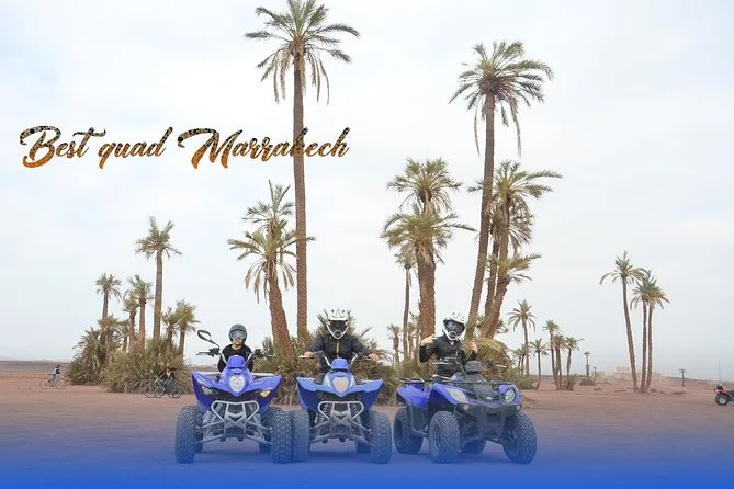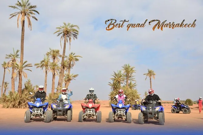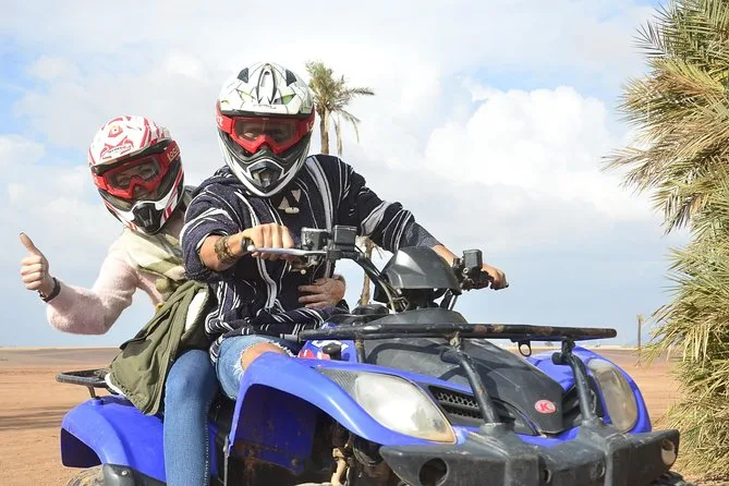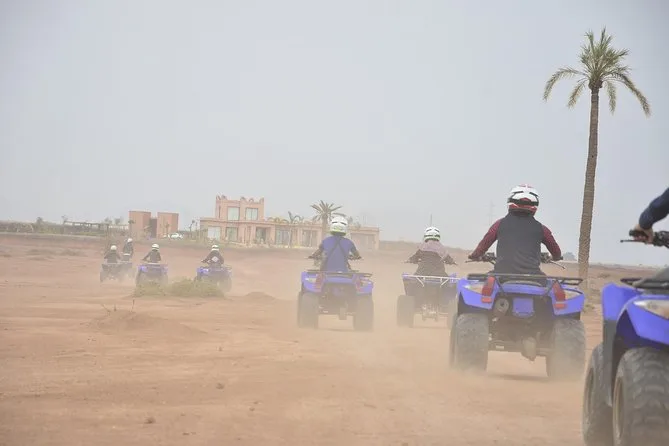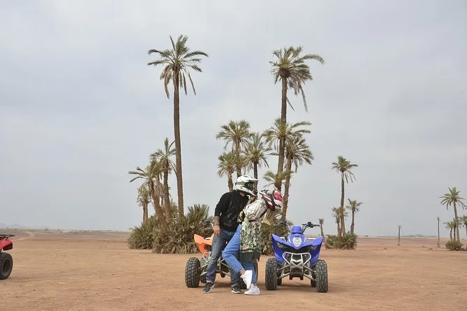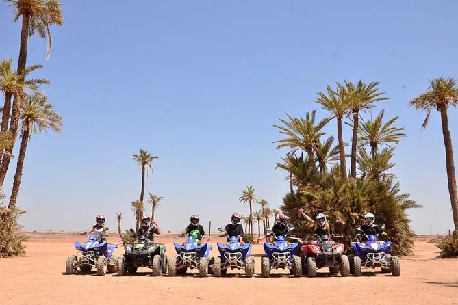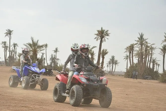 Your day includes hotel pickup and drop-off in Marrakech, guidance from a local driver throughout your adventure, an afternoon tea break served in a traditional bivouac among the palms, plus both quad biking and camel rides before heading back into town together.
