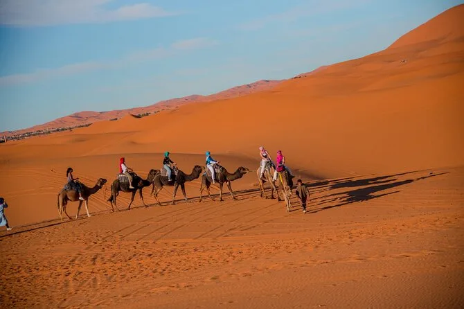 Your spot includes hotel pickup/drop-off in Marrakech & Fes, all transport in an air-conditioned minibus or 4x4 (depending on group size), guided visits to major sights like Ait Ben Haddou and Todra Gorge, overnight stays in a roses valley hotel and Merzouga desert camp (with dinner & breakfast), camel trek across Erg Chebbi dunes plus sandboarding fun—all led by friendly local guides who know every shortcut and story along the way.