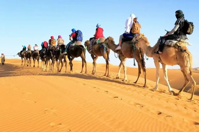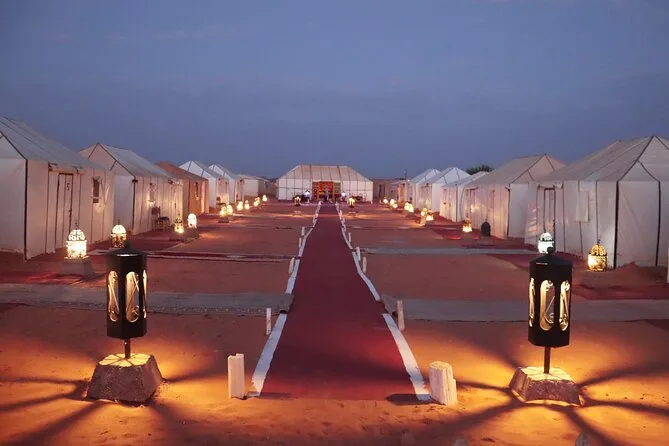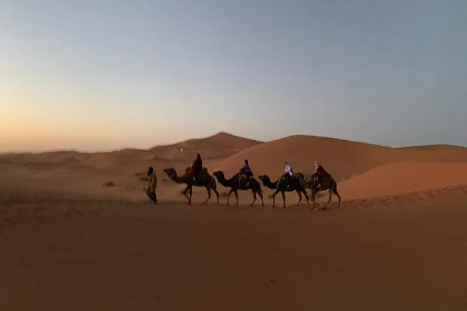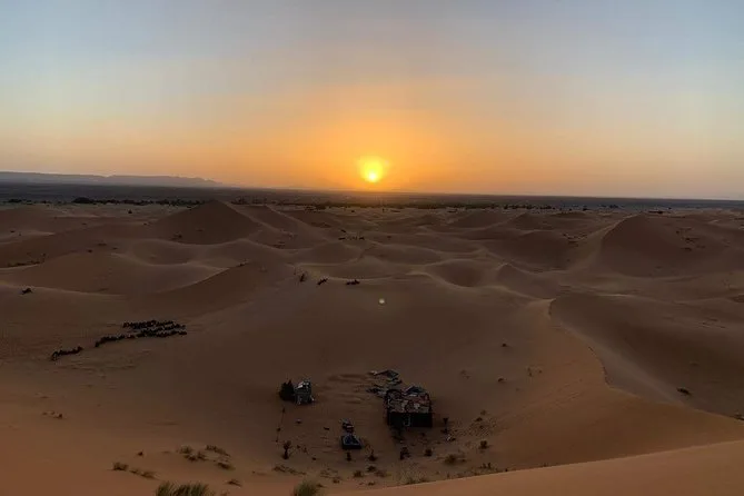 Your three days include hotel pickup in Marrakech, guided visits through Aït Benhaddou kasbah and Berber villages, an overnight stay at Kasbah Dades Amazigh or similar guesthouse plus private tent accommodation in an Erg Chebbi Sahara desert camp (with bedding), two dinners and two breakfasts featuring local Moroccan dishes, as well as a camel trek into the dunes—all capped off with drop-off at your chosen riad or hotel in Fez.