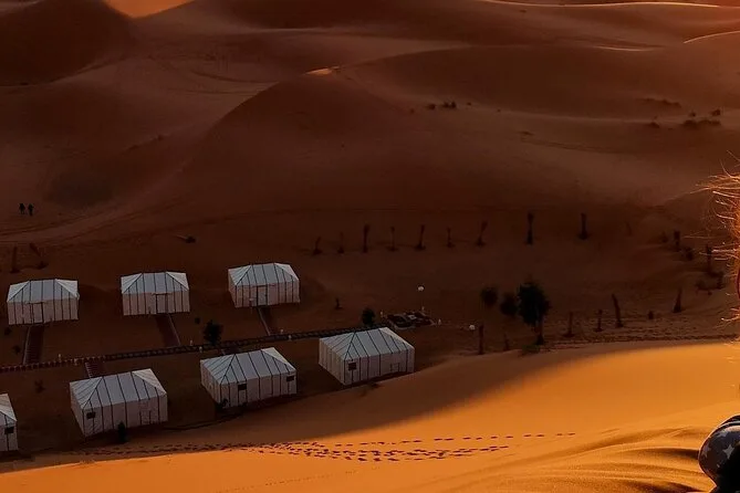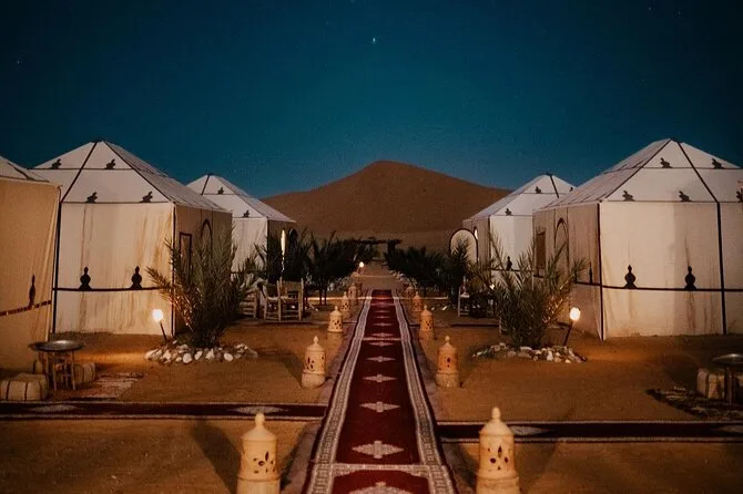 You’ll stay one night in a comfortable hotel or riad (Tinghir/Dades) and one night in a traditional tented camp in Merzouga—with an option to upgrade to luxury tents.