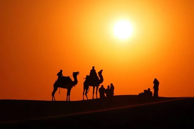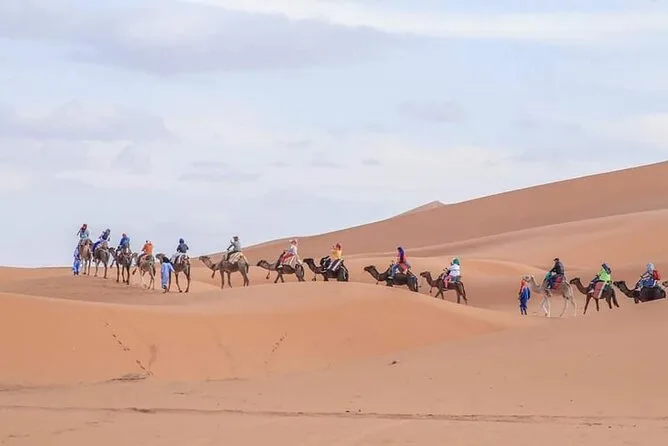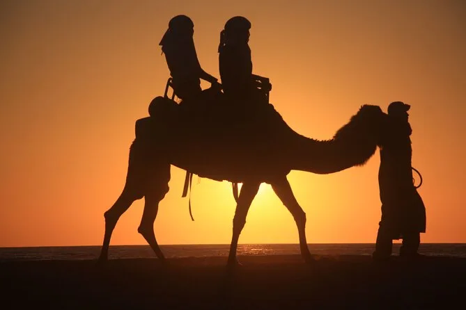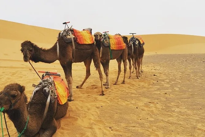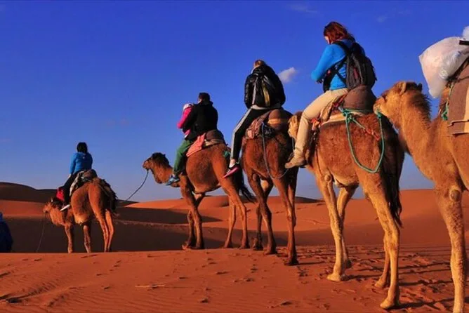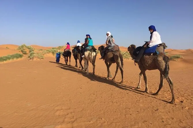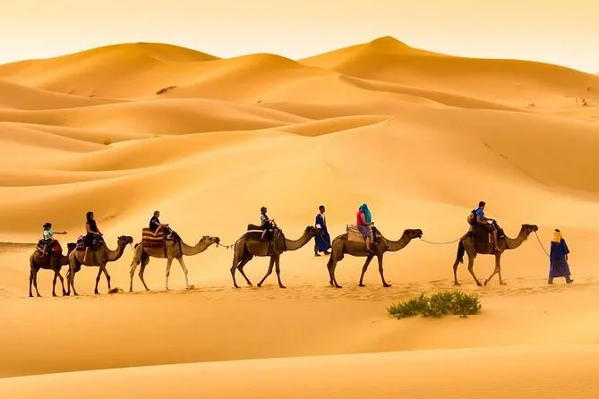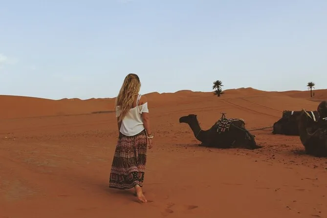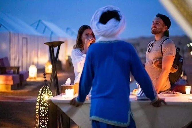 You’ll ride camels across Erg Chebbi’s golden dunes, feed them by hand, try your luck at sandboarding, and spend a cozy night in a luxury Sahara camp with local food and music under endless stars.