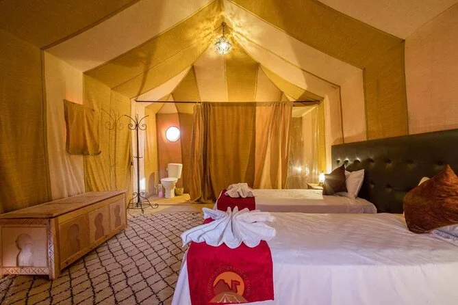 This experience covers dinner and breakfast (with soft drinks), all camel rides led by local guides, your stay in a comfortable luxury tent with ensuite bathroom in Merzouga’s desert camp—and yes, plenty of time for feeding camels or trying sandboarding if you like.