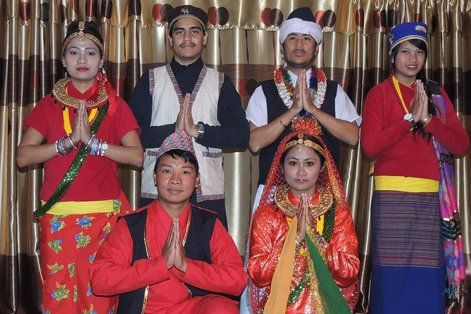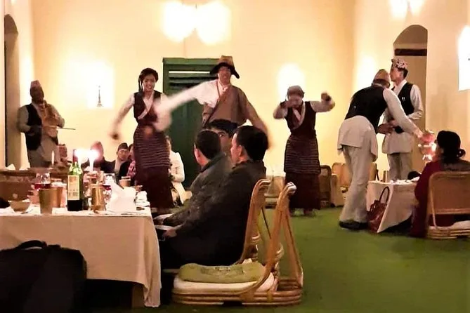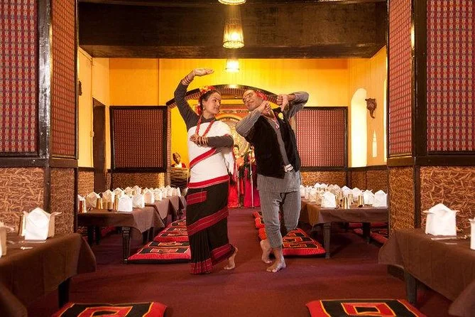 Your evening includes private transport to and from your hotel in Kathmandu, entry to Bhojan Griha, a full Nepali dinner with several courses (including snacks and dessert), plus live dance performances representing different ethnic groups across Nepal.