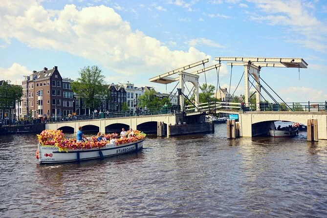 Your day includes a 60-minute flower boat canal cruise through Amsterdam with a friendly local guide sharing stories along historic routes like Herengracht and past famous sights such as the seven bridges—plus plenty of time for photos at some of the city’s best spots before returning to your starting point on the Amstel River.