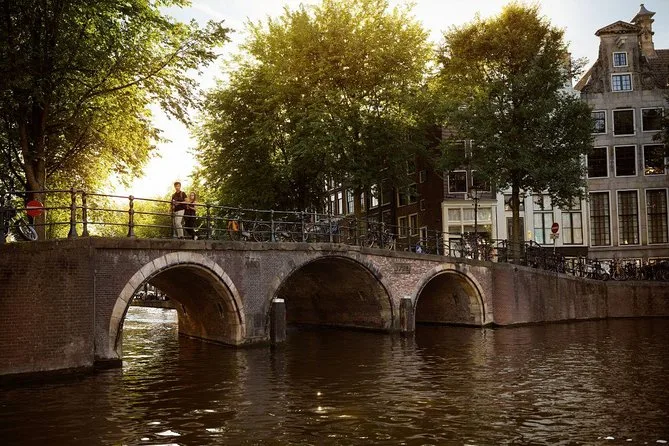 You’ll pass sights like Skinny Bridge (Magere Brug), Mint Tower (Munttoren), Herengracht canal houses, Jordaan neighborhood, Amstel River, Rijksmuseum (from outside), Westerkerk church, Anne Frank House, and more.