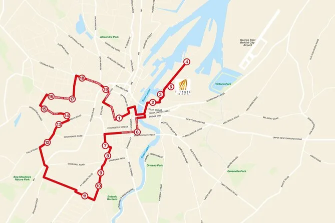Main stops include Titanic Belfast, Peace Wall, Queen's University, Crumlin Road Gaol, St George's Market and more.