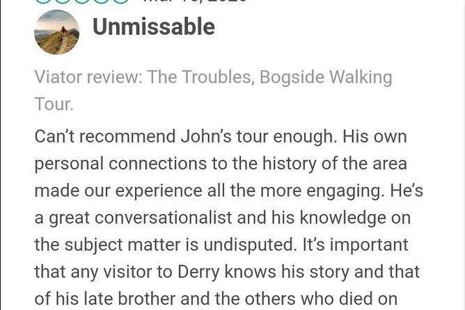 You’ll walk Derry’s Bogside with someone who lived through its hardest days, hearing stories right where they happened. See famous murals up close, stand at the Bloody Sunday site, ask anything you want — even if it’s hard to say out loud. This tour isn’t just history; it’s memory shared in real time.