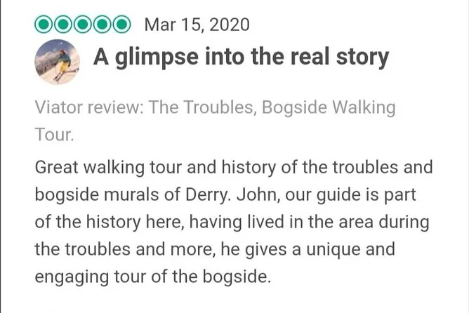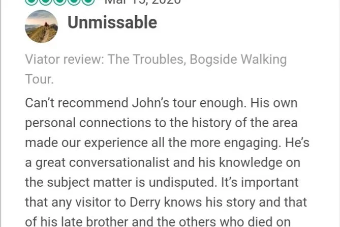 You’ll see the Free Derry Wall, Bogside murals, Bloody Sunday monument and massacre site.