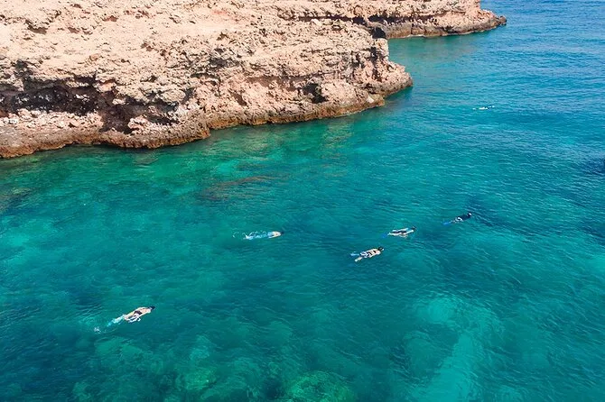 Your day includes all snorkeling equipment (no single-use plastics), entry fees and taxes covered upfront, fresh fruit snacks and sandwiches served on deck between swims or after exploring sandy beaches when allowed by nesting seasons—all led by local guides who know these waters well before returning by boat to Muscat.