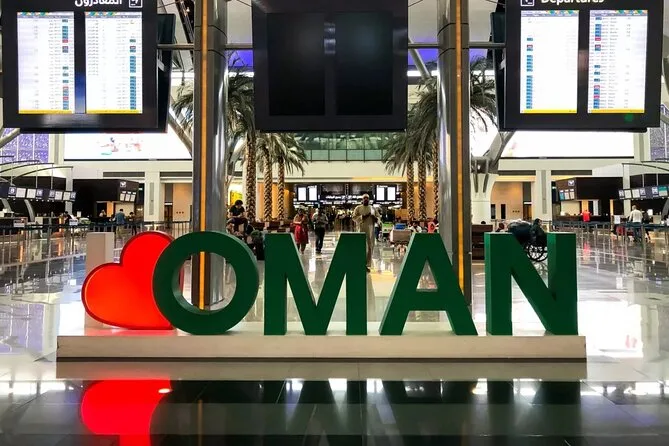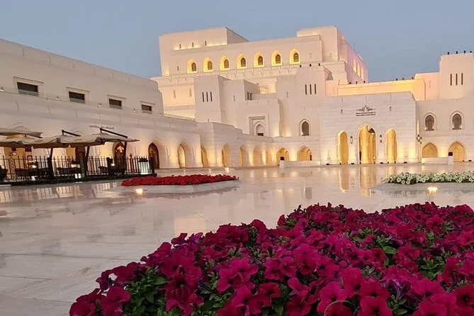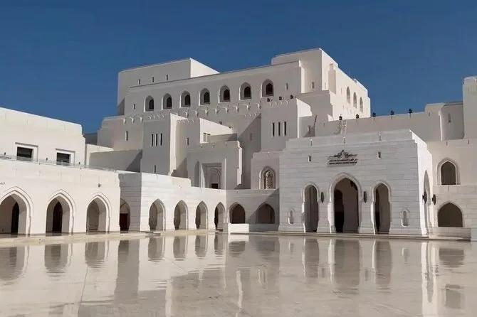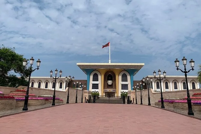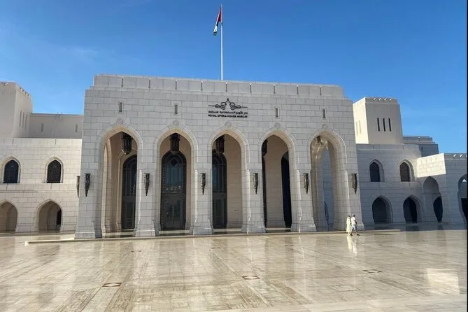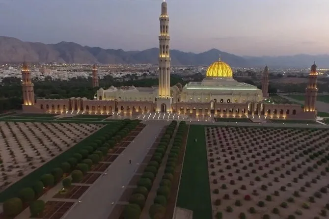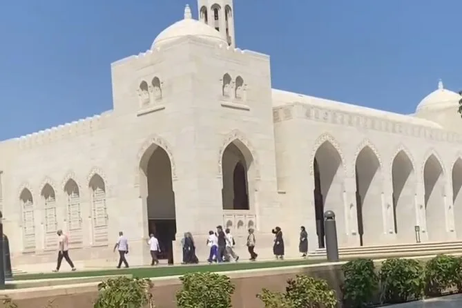 The itinerary covers Sultan Qaboos Grand Mosque, Royal Opera House area, Qurum Beach, Muttrah Souk, Al Alam Palace, Al Jalali & Al Mirani forts.