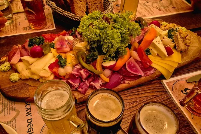 Your evening includes a guided walk through Gdańsk Old Town with at least thirteen tastings across three or more restaurants (think wild boar stew or pickled herring), one craft beer plus a shot of Polish vodka (or non-alcoholic alternatives for younger guests), all led by a local guide sharing stories about city life and traditions along the way.