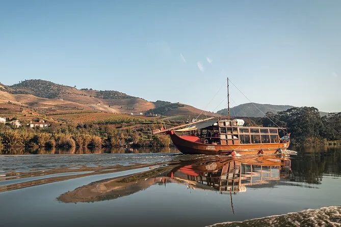 The cruise uses a traditional Rabelo boat typical of the Douro region.