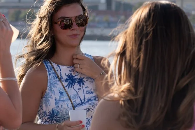 We passed MAAT — that white wave-shaped building — and then João slowed so we could see the Monument to the Discoveries up close. Someone asked about all the statues on it, and he started rattling off names in Portuguese that I’m sure I mispronounced later. The sun started dipping lower by Belém Tower, turning everything gold. It’s weird how quiet things get on the water; you can hear snippets of laughter from other boats, but mostly it’s just wind and distant gulls. My friend tried to snap a photo of Cristo Rei across the river but got mostly her own hair in the frame — she laughed so hard she nearly spilled her drink.