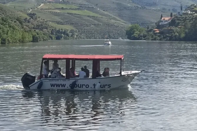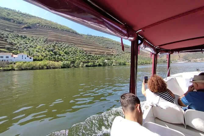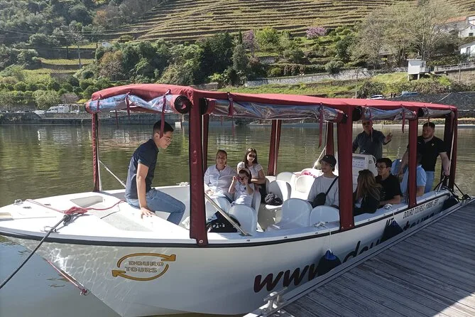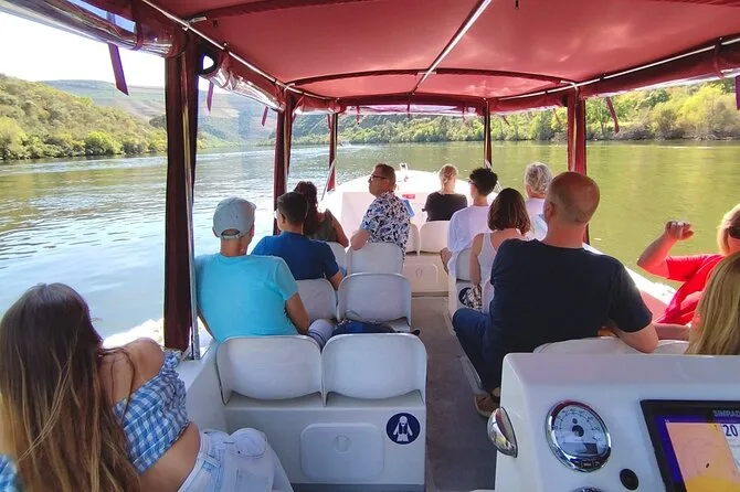 Your hour-long journey includes an onboard guide speaking Portuguese and English throughout, individual seating under sun or rain protection, a complimentary glass of Port wine with a short introduction to different types of Port wines—all while gliding past iconic Douro Valley scenery before returning to Pinhão’s riverside dock.