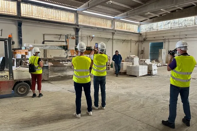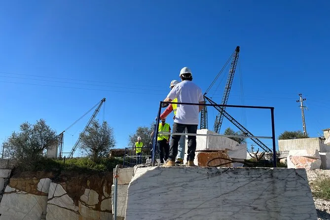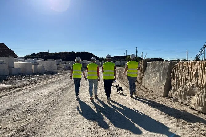 Your day includes guided visits to working marble quarries near Vila Viçosa and Borba plus entry to both industrial sawmills and small artisan workshops; all necessary safety equipment like helmet and vest are provided for use during each stop before being returned at the end.