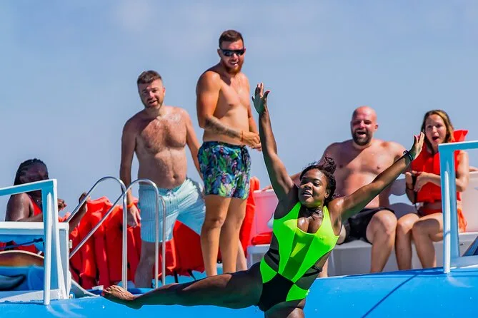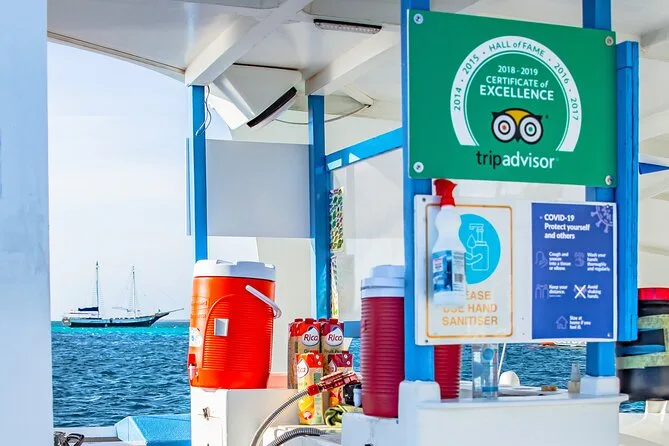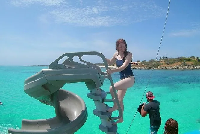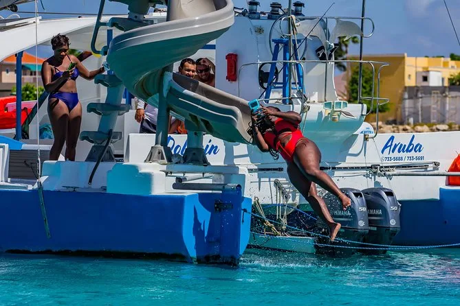 Seu dia inclui duas paradas guiadas para snorkel no naufrágio Antilla e no recife Boca Catalina com todo o equipamento incluso, bebidas ilimitadas no open bar com coquetéis e refrigerantes, almoço leve com wraps e frutas tropicais servidos por uma equipe local simpática, além de acesso a atividades divertidas como balanço de corda e tobogã aquático antes de voltar navegando pela costa de Aruba.