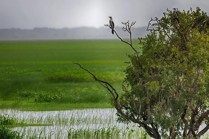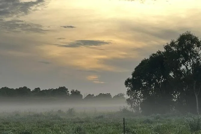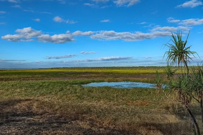 Depois, seguimos para a Reserva de Conservação Fogg Dam. Não era só passarinho — embora tivesse bando por todo lado — mas também wallabies pulando na grama alta e algo mexendo perto dos meus pés (provavelmente um lagarto... ou talvez não). O céu parecia enorme aqui, nuvens correndo rápido sobre os pântanos verdes. Passamos por búfalos pastando perto da estrada; alguém na frente tentou contar, mas desistiu depois de dez. Não tem pressa nessa parte — só janelas abertas, vento quente, todo mundo em silêncio por um tempo, só o Dave apontando gansos-magalhães ou contando histórias de enchentes que isolavam cidades inteiras.