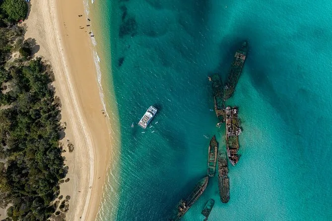 Comece o dia com café fresco e doces enquanto deixa Brisbane para trás rumo às praias brancas de Moreton Island. Faça snorkel guiado nas Tangalooma Wrecks, depois recarregue as energias com um buffet tropical — camarões gigantes e frango assado — antes de relaxar ou tentar stand up paddle nas águas cristalinas. Termine o passeio avistando golfinhos e tartarugas do barco, com o sal ainda na pele.
