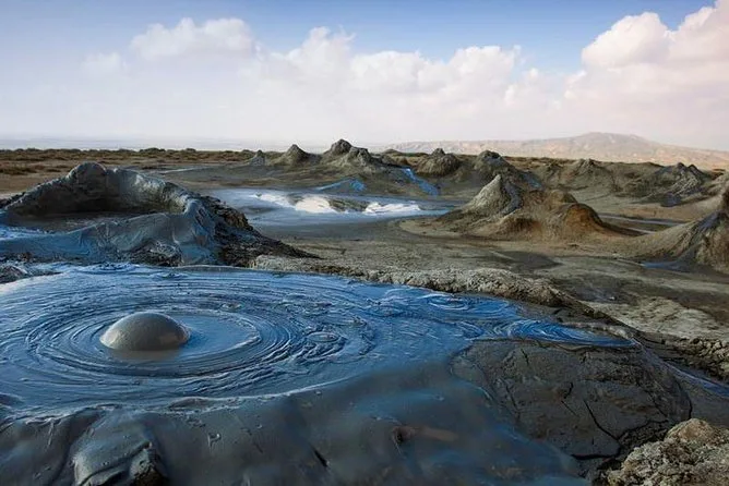 No dia seguinte, começamos cedo — café da manhã com chá forte e pão com queijo salgado antes de embarcarmos na van rumo ao Parque Nacional de Gobustan. A viagem tinha aquele clima de poeira iluminada pelo sol passando pela janela. Nos petroglifos, o guia explicou como as pessoas viviam ali há 40 mil anos. É estranho tocar em inscrições tão antigas; a pedra é áspera e você quase imagina alguém agachado ali, esculpindo. Depois, trocamos para um Lada velho e barulhento para chegar aos vulcões de lama. Confesso que não esperava que fossem tão… vivos? Eles borbulham e cuspem lama devagar — o cheiro é terroso e forte.