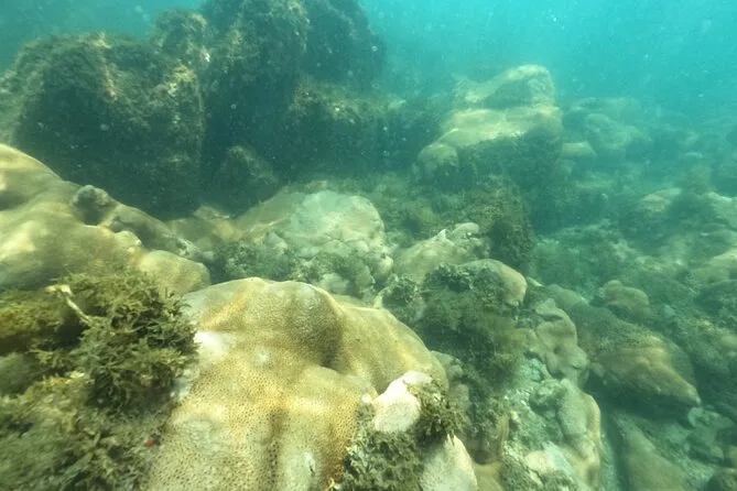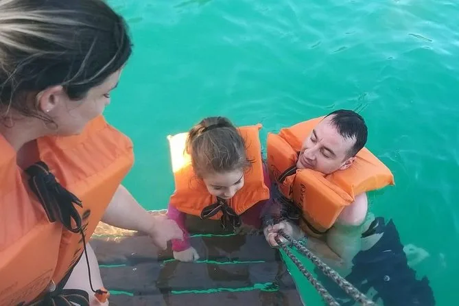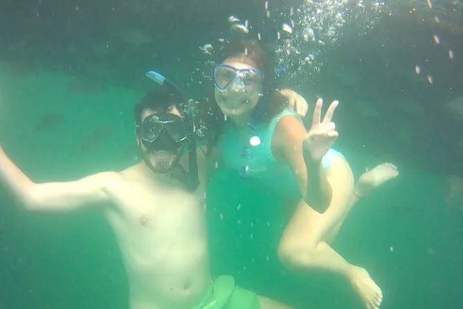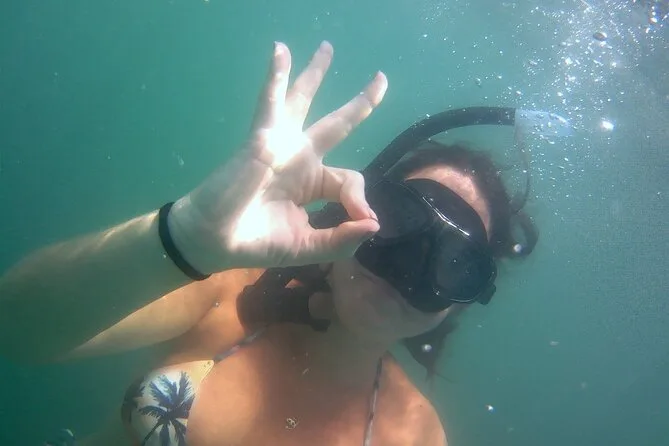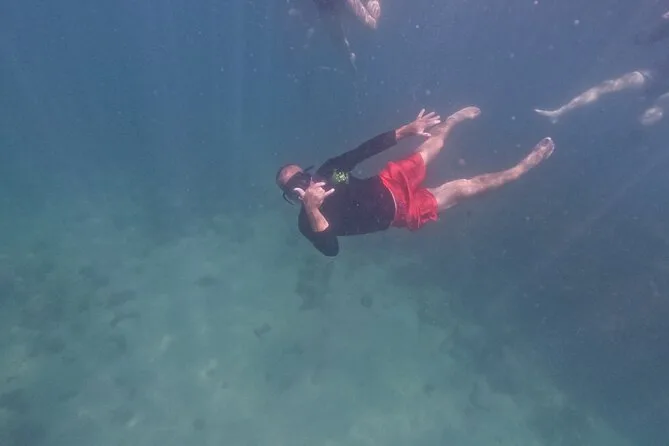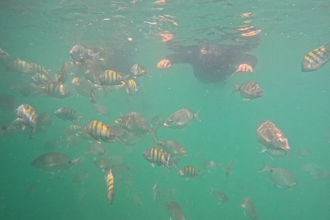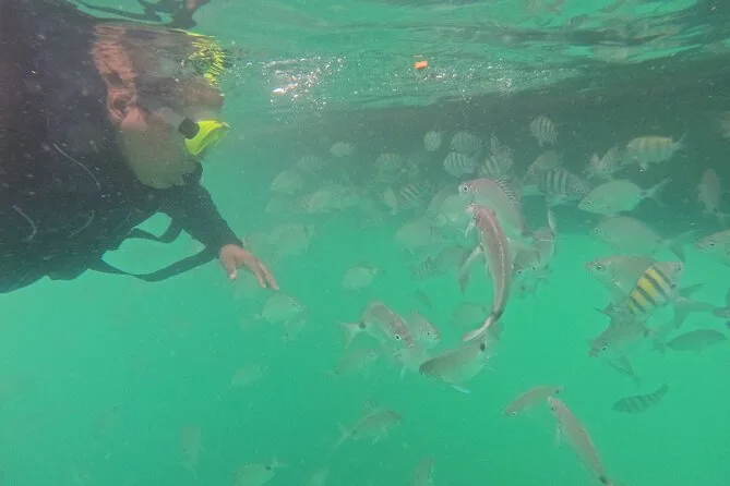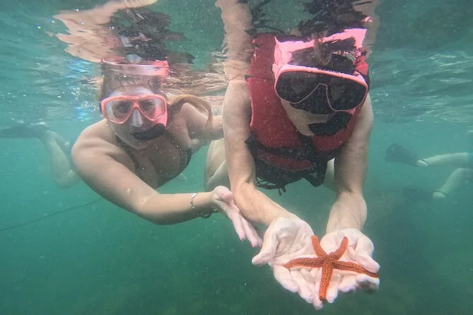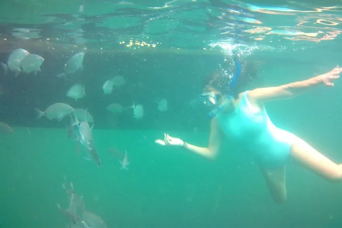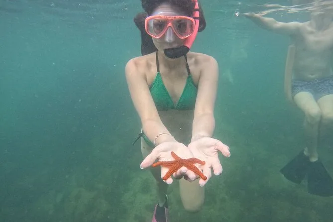 A primeira parada foi na Ilha do Macuco. Confesso que colocar o colete de snorkel foi meio estranho no começo (todo mundo precisa usar aqui), mas quando entrei na água — uau. Estava mais fria do que eu esperava, quase cortante nos braços, mas depois de um minuto flutuando e vendo pequenos peixes prateados correndo ao redor das minhas pernas… esqueci até do desconforto. A Ana ficava sempre checando a gente, fazendo piadas em português e inglês meio enrolado (“paparazzi dos peixes!”, ela se chamava enquanto tirava fotos debaixo d’água). Em um momento, ela me entregou uma estrela-do-mar — mais áspera do que parecia nas fotos.