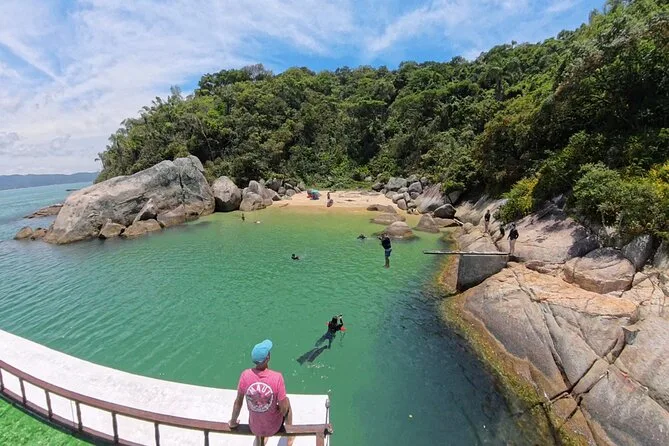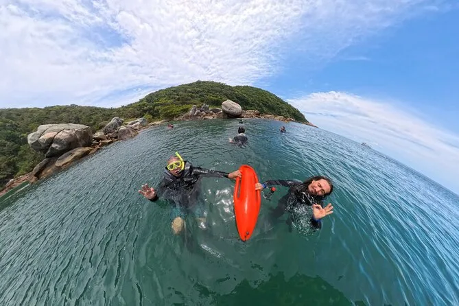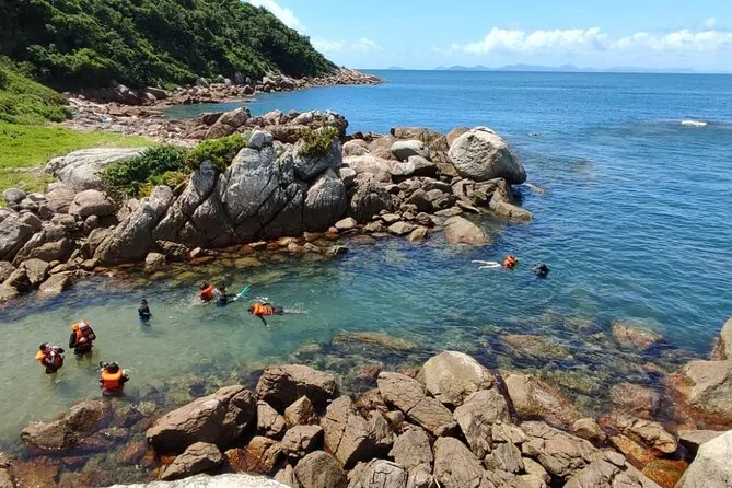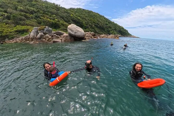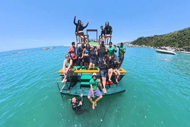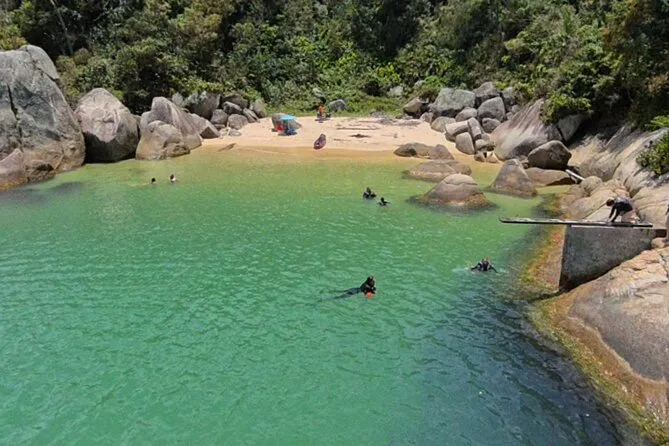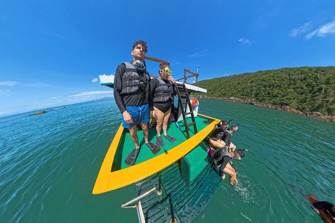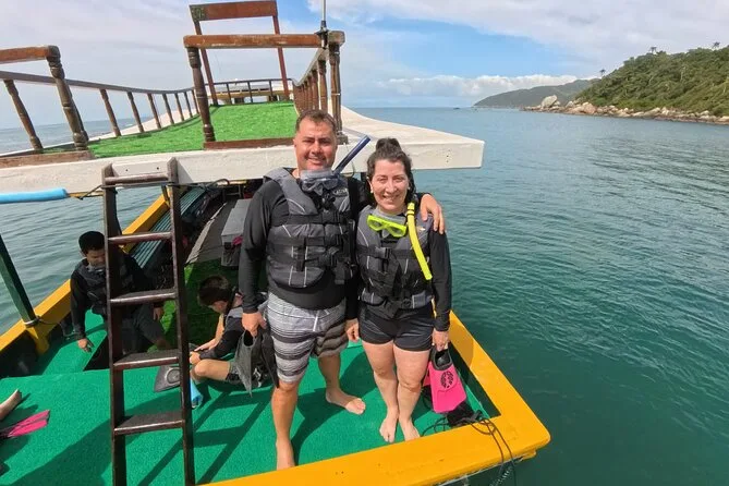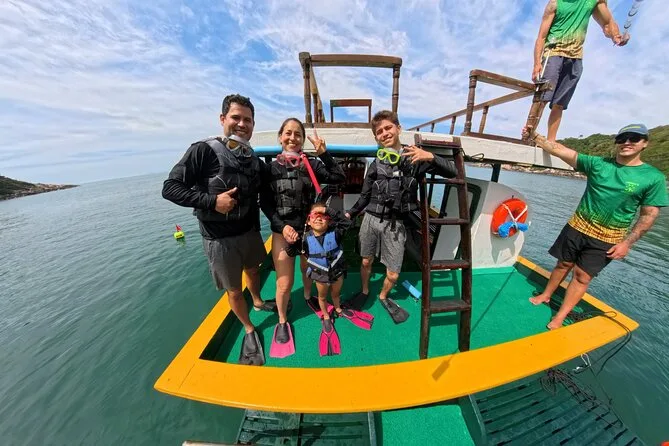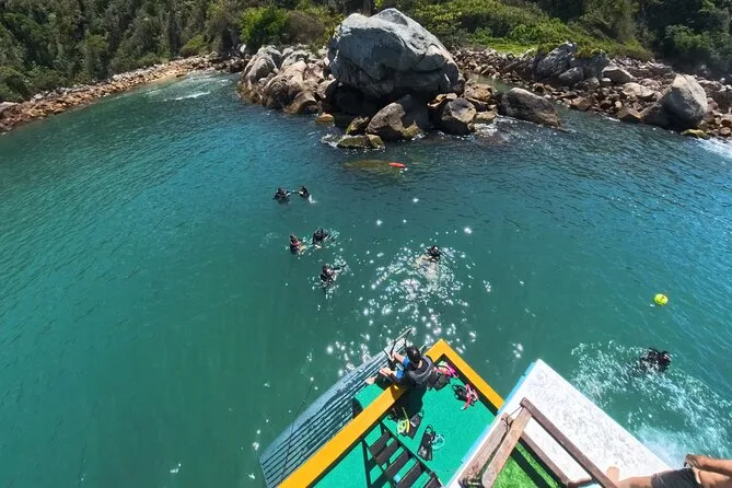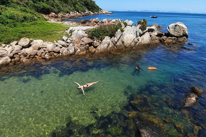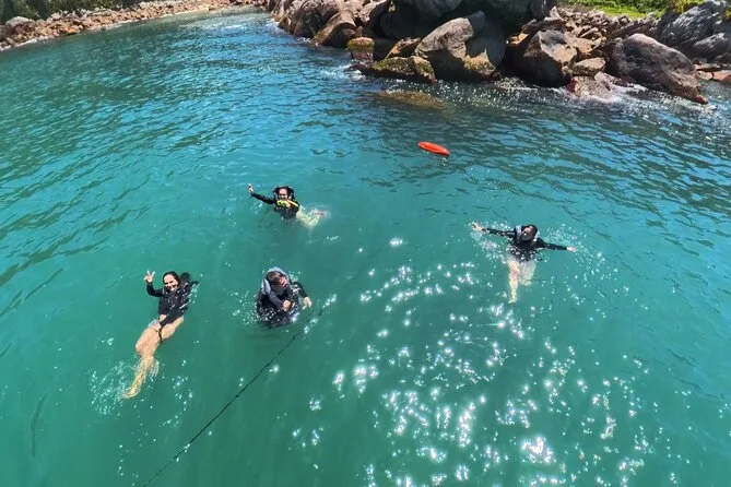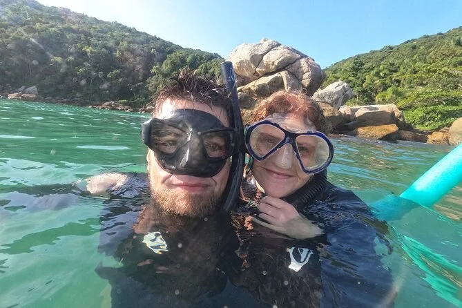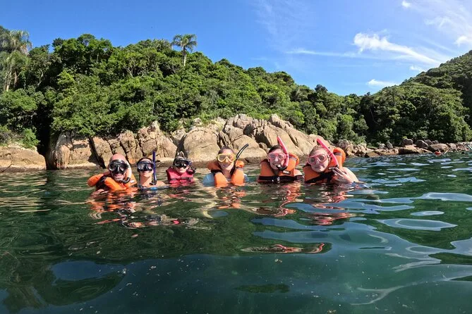 Seu dia inclui todo o equipamento de snorkel — máscara, nadadeiras, boias — e o uso obrigatório do colete na Ilha do Macuco; acompanhamento de instrutor certificado; fotos subaquáticas com GoPro; além de tempo para relaxar na Praia do Cação antes do retorno pela costa da Baía de Zimbros.