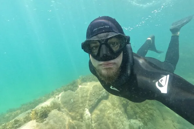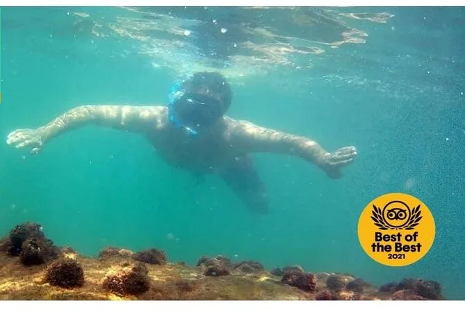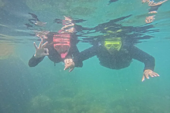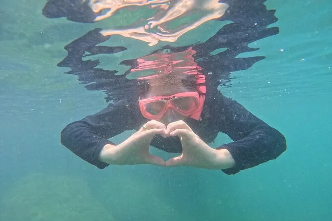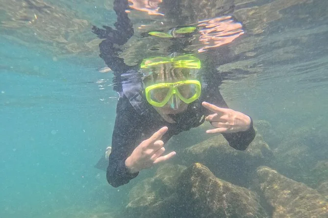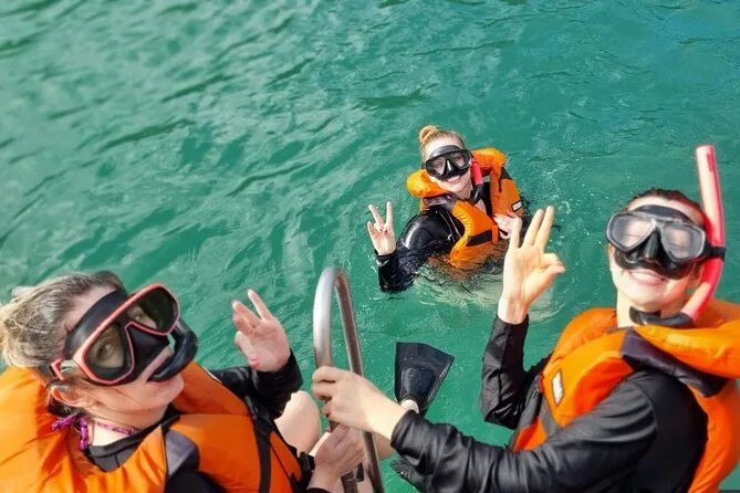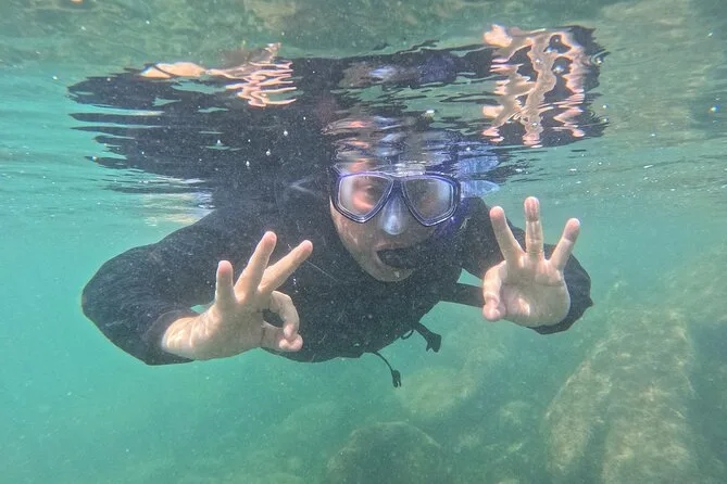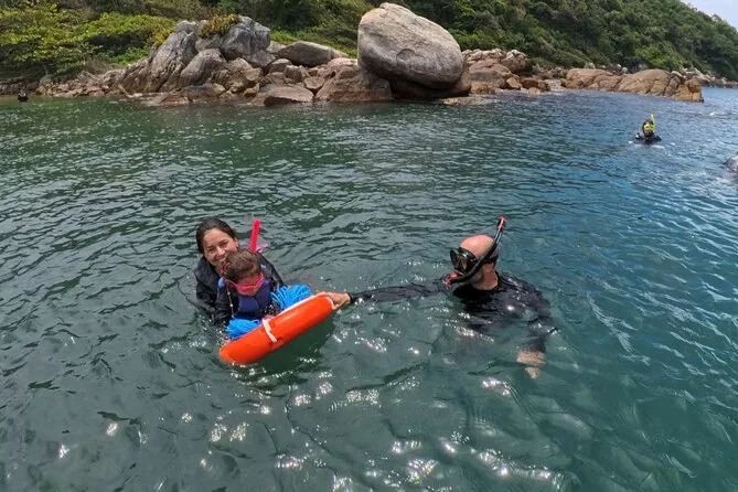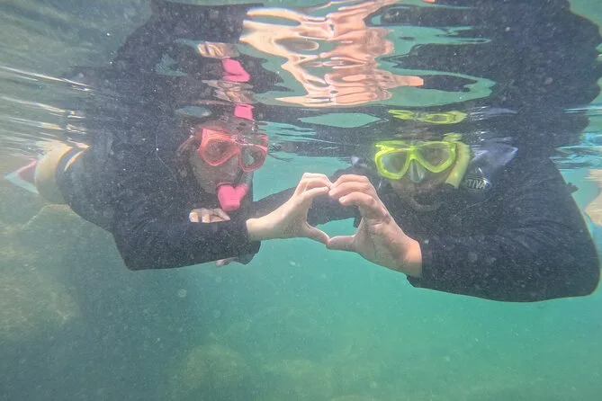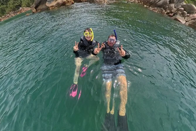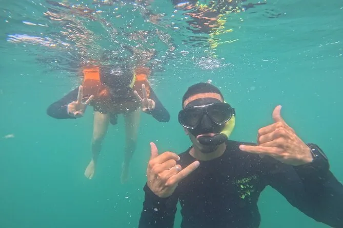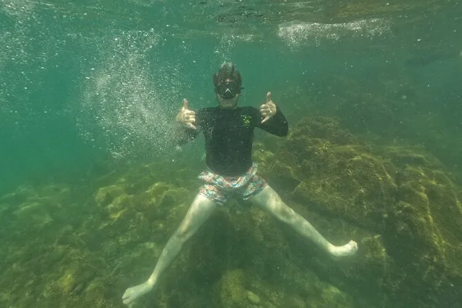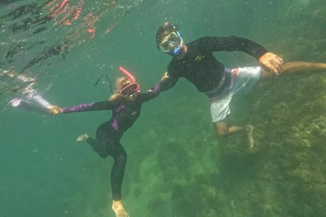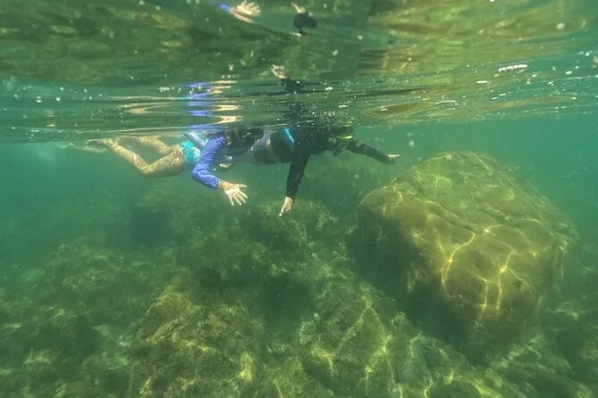 Seu dia inclui todo o equipamento de snorkel — máscara, nadadeiras, boias — e o uso obrigatório do colete na Ilha do Macuco; acompanhamento de instrutor certificado; fotos subaquáticas com GoPro; além de tempo para relaxar na Praia do Cação antes do retorno pela costa da Baía de Zimbros.