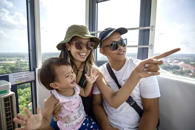 Do alto de 85 metros, você terá uma vista incrível de Siem Reap, com Angkor Wat e a Montanha Kulen no horizonte. O passeio é tranquilo, confortável e ideal para famílias ou quem quer ver a cidade mais famosa do Camboja por outro ângulo.