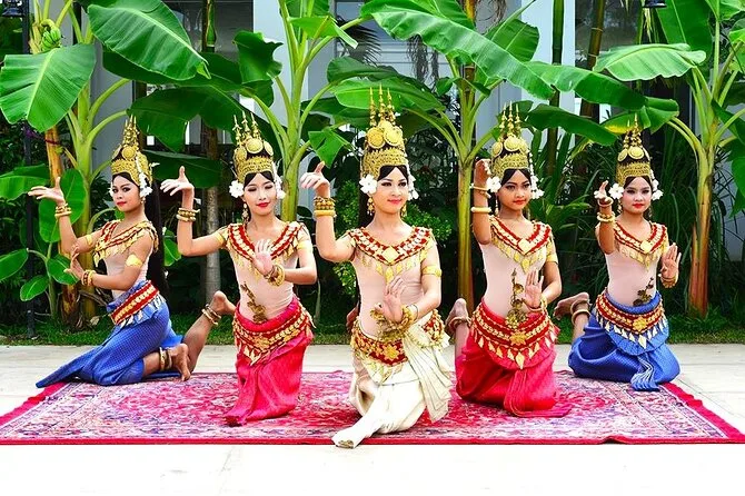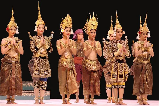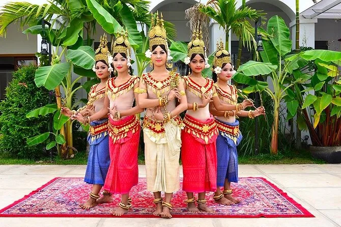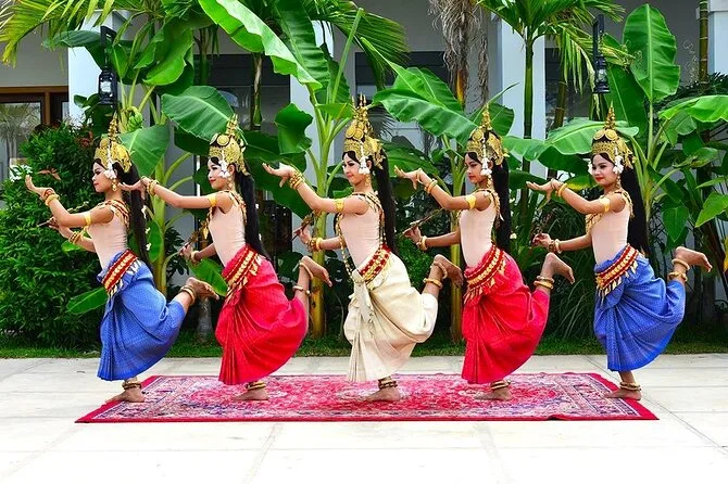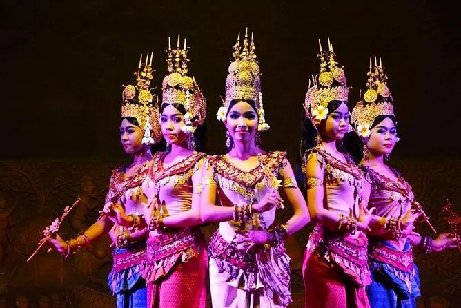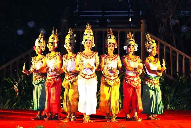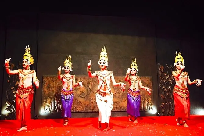 Sua noite inclui transfers de tuk-tuk ida e volta do hotel em Siem Reap, jantar cambojano com quatro pratos (incluindo sobremesa) e assentos reservados para cinco apresentações tradicionais de dança — tudo organizado para você relaxar e aproveitar cada momento.