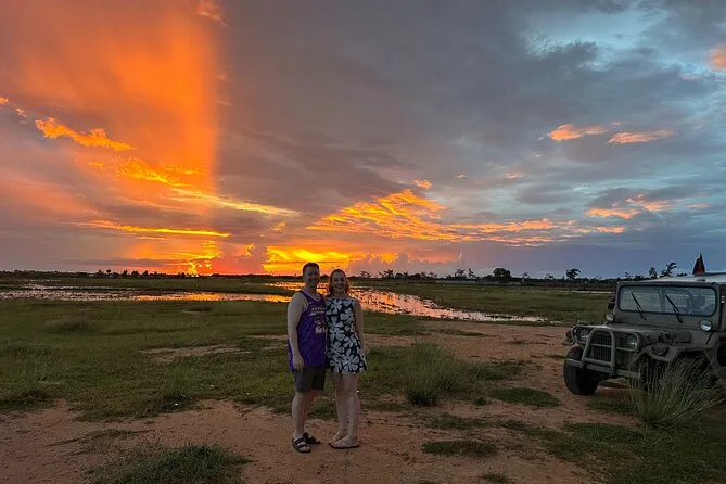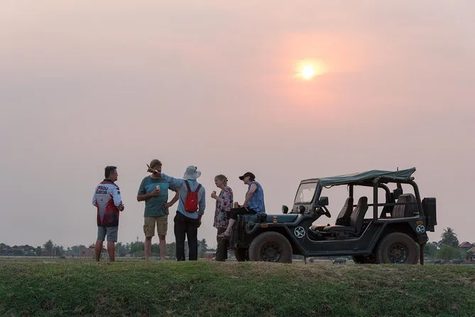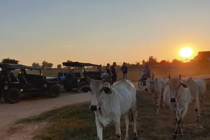 Seu dia inclui traslado do hotel em Siem Reap, todo o transporte em jeep aberto com guia local que fala inglês, água mineral para se refrescar pelo caminho, snacks para quando bater a fome, além de bebidas alcoólicas servidas ao pôr do sol antes do retorno à cidade no começo da noite.