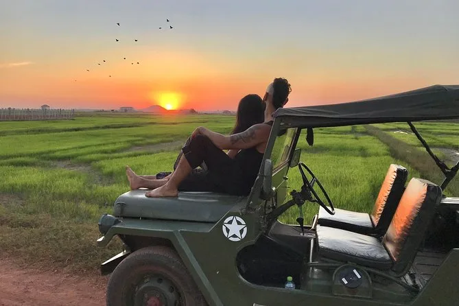 Siem Reap: Passeio de Jeep ao Entardecer com Visita ao Mosteiro e Drinks