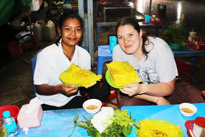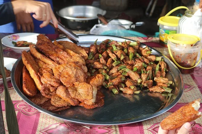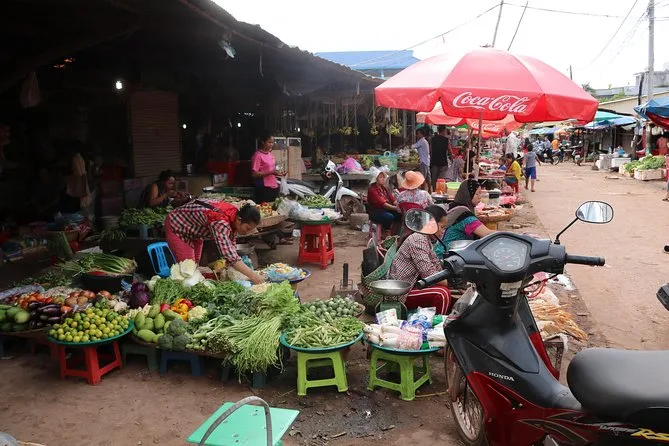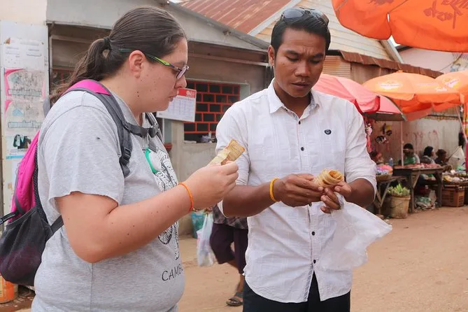 Você vai explorar as ruas vibrantes de Siem Reap de remok com um guia local, provando comidas de rua khmer, de espetinhos fumegantes a petiscos ousados como grilos fritos. Visite mercados de frutas cheios de vida e junte-se aos moradores no ponto de piquenique favorito para jantar e histórias inesquecíveis.