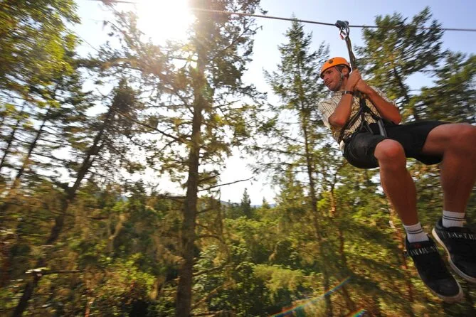 Seu dia inclui transporte ida e volta se selecionado na reserva, todo equipamento de segurança ajustado pela equipe na chegada, um percurso guiado de duas horas pelas tirolesas na copa da floresta da Ilha de Vancouver com oito linhas e uma ponte suspensa — tudo conduzido por guias locais experientes que contam histórias durante o trajeto.