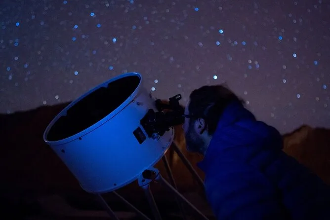 Sim — há uma sessão guiada de astronomia sob o céu claro do Atacama com telescópios disponíveis.