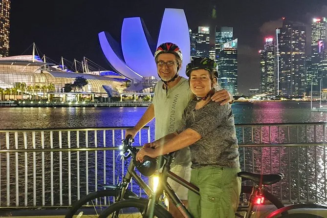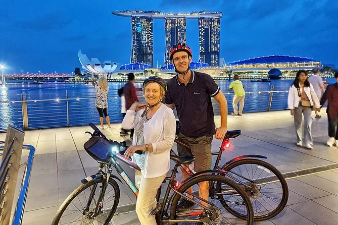 Seu passeio inclui aluguel de bicicleta com capacete, água mineral para manter você hidratado sob as luzes da cidade, armários gratuitos para guardar suas coisas na loja antes de seguir por Marina Bay com um guia local licenciado — além de capas de chuva caso pegue chuva no caminho.