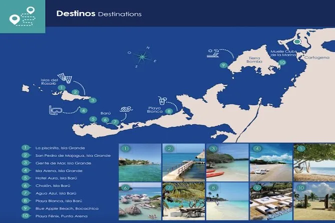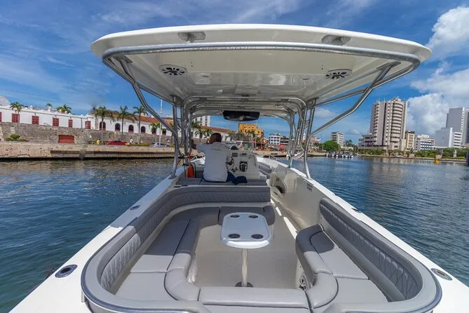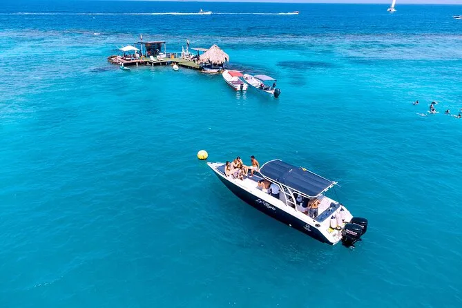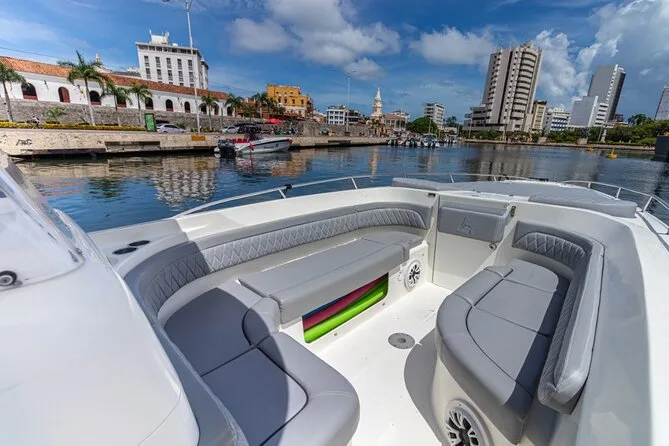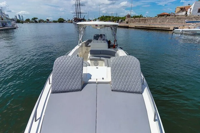 Seu dia inclui transporte privado de barco entre Cartagena e Islas del Rosario, com capitão e copiloto à disposição. O combustível está incluso, assim você não precisa se preocupar com custos extras. O barco tem sistema de som com WiFi para você curtir música durante o trajeto, além de uma caixa térmica para suas bebidas e lanches. É só chegar no horário marcado e relaxar enquanto a equipe cuida do resto.