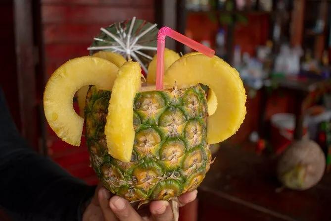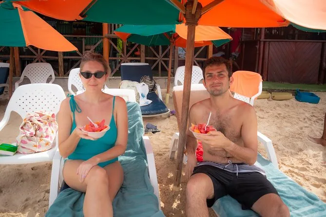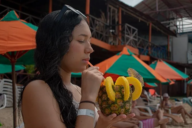 Seu dia inclui transporte de Cartagena até Playa Tranquila na Isla de Barú, entrada no Fosforito Beach House com coquetel de frutas de boas-vindas, uso de guarda-sóis e espreguiçadeiras, além de escolha entre peixe frito, peito de frango grelhado ou almoço vegetariano, com degustação da limonada de manga biche antes do retorno à tarde.
