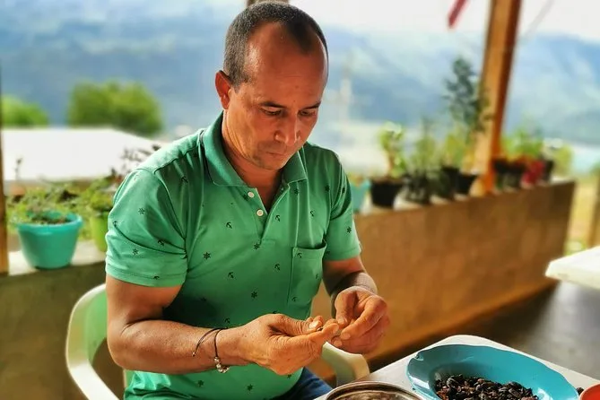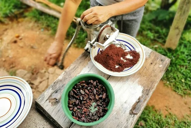 Você vai caminhar por plantações de cacau perto de Medellín, colher o fruto direto da árvore, ajudar a torrar e moer as sementes no fogo de lenha com agricultores locais e criar suas próprias barras de chocolate com ingredientes frescos da fazenda. Prepare-se para risadas com chocolate quente e pão de queijo — além de histórias que só aqui você vai ouvir.