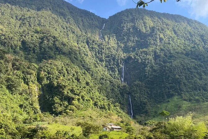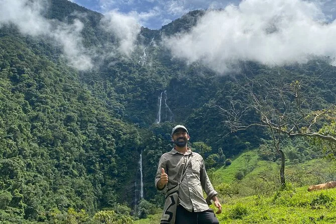Na manhã seguinte, começamos cedo com café forte e pão caseiro. Seguimos a trilha rio acima rumo à cachoeira La Esmeralda. Dá para ouvir antes de ver — um rugido constante que vai aumentando conforme você se aproxima. Quando finalmente chegamos à base, a névoa refrescava o rosto e um arco-íris apareceu por um instante entre as gotas. No caminho de volta, paramos num mirante com vista para o vale de Cocorná; duas outras cachoeiras cortavam as colinas verdes lá embaixo. É difícil não se sentir pequeno diante de tanta natureza.