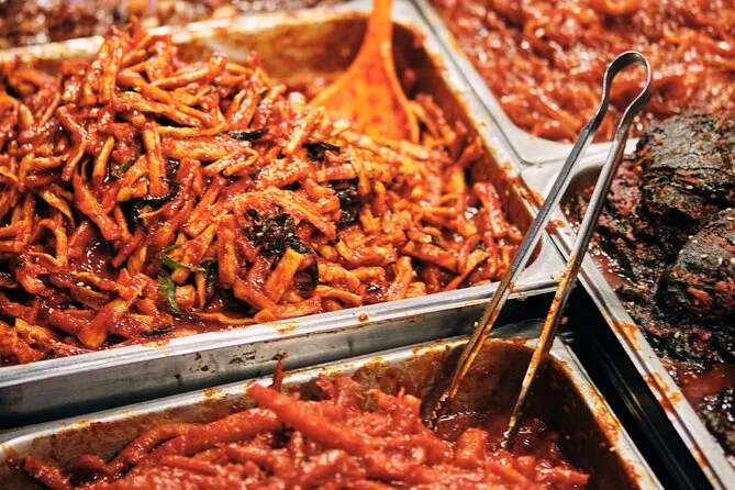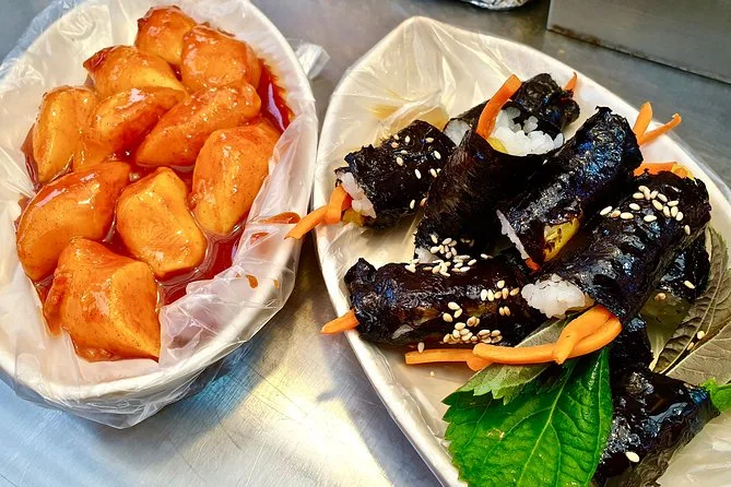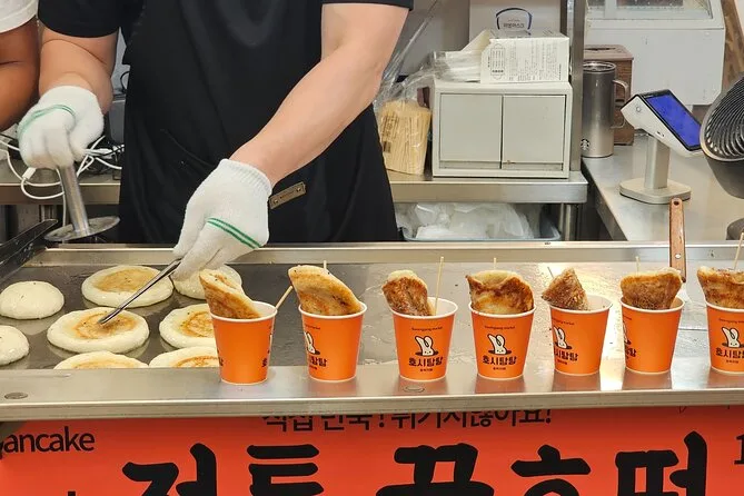 Seu dia inclui caminhadas guiadas pelos mercados e bairros dos palácios no centro de Seul, com mais de 8 degustações de comida de rua: mandu com sopa de peixe, kimbap fresquinho, pão doce com creme salgado, panquecas de feijão mungo com cebola, docinhos de mel ou bolo de arroz grelhado com chá, tteokbokki apimentado — e um prato secreto especial durante o percurso.