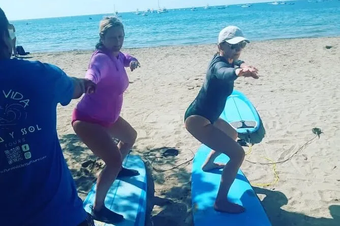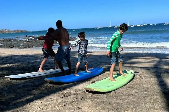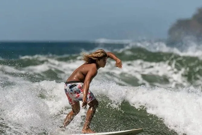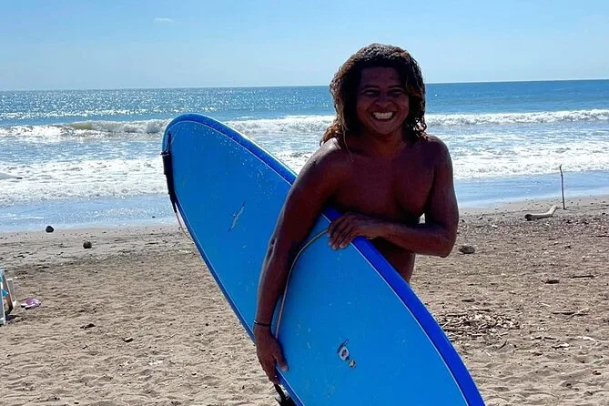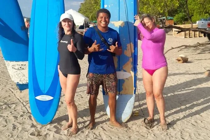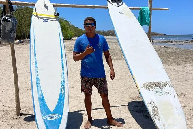 Seu tempo inclui todo o equipamento necessário para o surf — prancha adequada ao seu nível e lycra — além da orientação do Ronaldo durante a aula em grupo pequeno na Praia de Tamarindo.