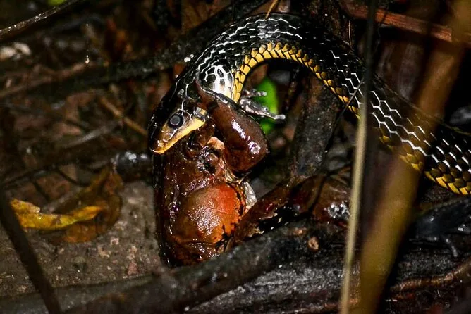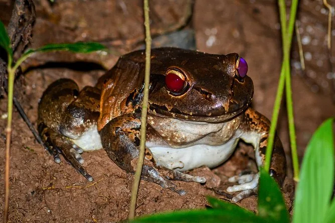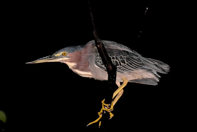 Você vai deslizar de barco pelos canais sombreados dos manguezais perto de Manuel Antonio com um guia local, procurando crocodilos, morcegos, caranguejos e muito mais enquanto a noite cai. Sem precisar caminhar — só observar a vida noturna se revelar diante dos seus olhos. A noite termina com um jantar e histórias sob o clima quente da Costa Rica — uma lembrança que fica para sempre.